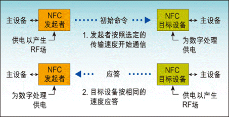 支持NFC的設備可以在主動或被動模式下交換數據。在被動模式下,啟動NFC通信的設備,也稱為NFC發起設備(主設備),在整個通信過程中提供射頻場(RF-field),如圖2所示。它可以選擇106kbps、212kbps或424kbps其中一種傳輸速度,將數據發送到另一臺設備。另一臺設備稱為NFC目標設備(從設備),不必產生射頻場,而使用負載調制(load modulation)技術,即可以相同的速度將數據傳回發起設備。此通信機制與基于ISO14443A、MIFARE和FeliCa的非接觸式智能卡兼容,因此,NFC發起設備在被動模式下,可以用相同的連接和初始化過程檢測非接觸式智能卡或NFC目標設備,并與之建立聯系。圖1為NFC主動通信模式:……[全文]