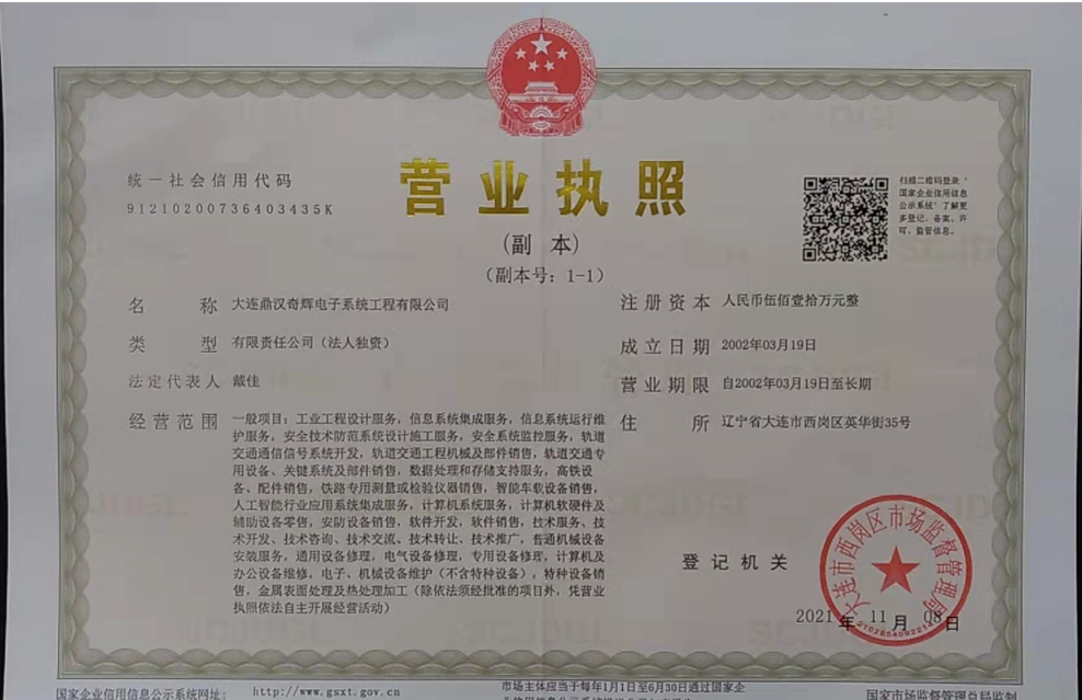 適逢鐵路基礎建設、城市軌道交通建設進入新一輪高速發展周期,鼎漢奇輝進入全面業務拓展的嶄新戰略發展階段。誠信立足,創新致遠。奇輝人將以滿足社會需求為已任,為發展高科技產業而努力奮斗。大連鼎漢奇輝鐵路設備,為鐵路信息化建設再創輝煌。