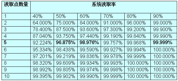 有的產品特別難以通過 RF 技術讀取到,在某個讀取點上的讀取率僅達到 50%,不過從概率論來看,假設一個系統只設 5 個讀取點的話,那么即便這種難以讀取的產品在整個系統中被讀取的概率也能達 97%(也就是說每 33 件產品中會漏讀 1 件產品)。下表顯示了讀取點數量與不斷提高的標簽讀取率之間的對應關系。如果我們能將標簽讀取率從 50% 提高到 60%,那么就設有 5 個讀取點的系統而言,其整體讀取率就能達到 99%(100 件產品中漏讀 1 件產品)。如果讀取率提高到 90%,那么我們就能實現所謂“五個九”的近似完美的讀取率(即設有 5 個讀取點的系統讀取率高達 99.999%,每 10 萬件產品僅漏讀 1 件)。