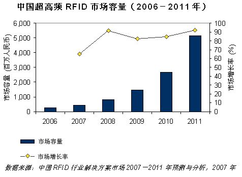 據IDC最新發布的報告《中國RFID行業解決方案市場2007-2011年預測與分析》顯示,2006年RFID跨行業應用總體市場規模為24.2億元(約3.02億美元),涵蓋的應用領域包括供應鏈、人員、財產、車輛管理,門禁控制、防偽、動物識別等,其中超高頻RFID應用市場規模占RFID總體應用規模的10.4%。2006年的超高頻市場在供應鏈、車輛管理等方面實現了更多的卓有成效的試驗項目,而且在機場行李跟蹤等實際應用上正在形成成熟的解決方案。IDC預計到2011年超高頻RFID市場規模將達到51.5億元(約6.42億美元),未來五年復合平均增長率達82.8%。
