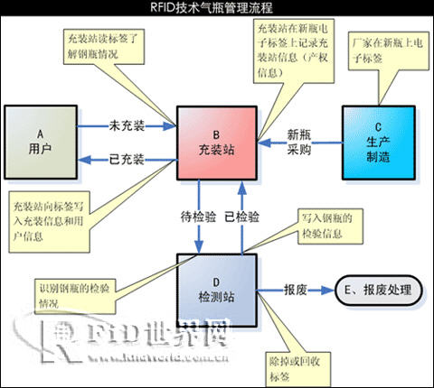 c) 氣瓶的流通過程中,通過讀取電子標簽記載的產權信息,保證定點充裝;根據電子標簽記載的檢驗和制造信息,保證定期檢驗和到期報廢。
