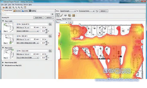 Ekahau Site Survey能為802.11a/b/g網絡設計、建置和驗證提供一種新型方式,在實際射頻性能數據的基礎上實現射頻覆蓋范圍可視化。與其它單獨依賴于不精確的理論模型的工具不同,采用ESS對一整個設施進行快速測量所耗時間只占使用傳統測量方法所用時間的一小部分。在網絡建置之前,ESS 可以在計算機屏幕上準確預報、模擬Wi-Fi性能,很好地為網絡規劃人員和管理人員提供預期的網絡規劃和性能。拖放式的用戶界面允許定制設施樓層平面圖,并了解一些參數,如:墻體材料和位置、接入點天線選件及傳輸功率等。EES采集、分析、顯示的關鍵參數包括:RSSI(無線信號強度)、干擾、SNR(信噪比)、最強接入點、總接入點數、信道信號和數據速率等。ESS 并能自動生成綜合報告。