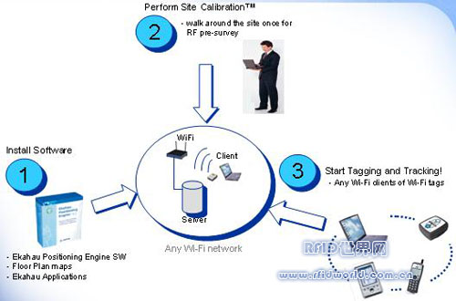 工作原理:無線信號強度(RSSI)方式。設備附近無線信號被記錄下來,Ekahau定位引擎里有無線信號的設置原型,定位引擎識別RSSI的值,并計算出地圖中二維坐標,客戶程序發送RSSI到定位引擎,定位引擎計算客戶程序并發送定位信息給應用程序。