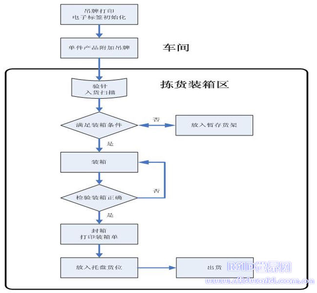 在驗針機上安裝RFID讀寫器,每一件產品在驗針的同時即經過通道掃描,進入揀貨裝箱區存貨監控; |