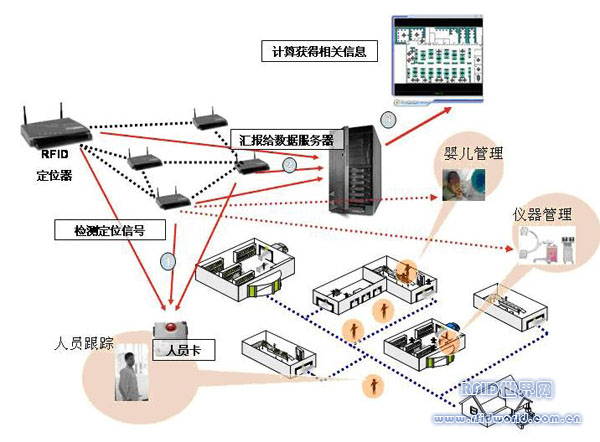 病人管理、病人追蹤、設備追蹤等管理以智能射頻定位器和射頻標簽卡為核心設備,根據不同的應用范圍(人、物)及管理要求,可采用不同的應用方案。