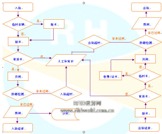本停車場有1個入口,1個出口。在進入停車場的入口車道處安裝1套入口控制設備,在停車場的出口車道處安裝1套出口控制設備,并在出口處設立1個出口收費處,安裝一套電腦收費管理設備。停車場的收費管理、臨時卡、月租卡、免費卡的發售均由管理中心的管理電腦完成。