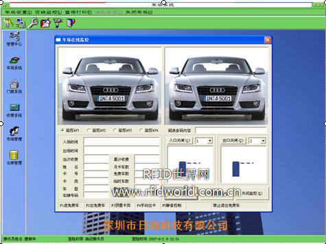 系統還在停車場的出入口各安裝一臺高解析度彩色攝象機、固定支架、自動光圈,可24小時監視車輛出入情況,可看清車牌。當有車進停車場,刷卡時將啟動入口攝象機抓拍圖象傳送到電腦,存入數據庫中;當有車輛駛離車場時,車輛除應交納必要的停車費用外,駛離車輛的所以資料(車牌、型號、顏色等)都必須與進來的資料對比相同,閘桿才抬起,則可通行。