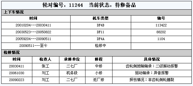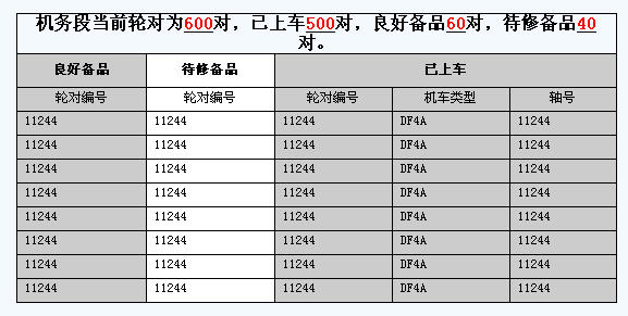 在此界面上將列出當前機務段全部輪對數量,另列出已上車數量,良好備品數量,待修備品數量。對后二者,還要列出機車類型和軸號,如下圖: