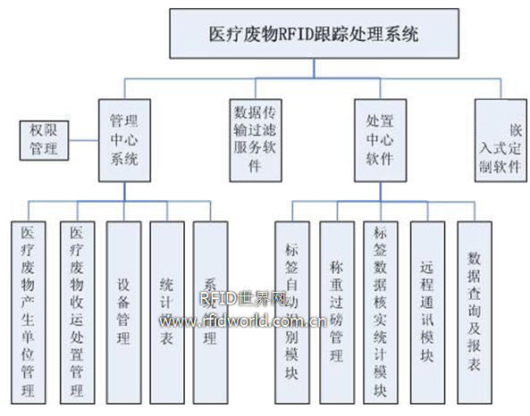 醫療廢物RFID監控系統從系統結構上分為四個互相關聯的部分,分別是環保局固廢處部分、中轉中心部分、焚燒中心部分、移動辦公平臺。