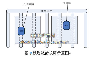 1:傳送機構的吊斗為鐵質耙齒,而原有流程中會放置在鞋盒的底部,計量卡會有一定概率貼在耙齒上,因鐵質背景對RFID標簽的固有影響造成無法識讀,導致漏讀現象。