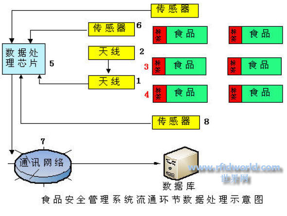 電子標簽閱讀器1開始工作后,向天線2發出讀標簽3的指令,食品4上的電子標簽3在接收到天線2發出的無線電波能量后,向天線2發出序號信息,天線2接收此信號,并把此信號傳送給閱讀器1,閱讀器對接收到得信號進行相應的處理后埋在傳送給集成在閱讀器中的數據處理芯片5,于此同時,分布在本流通環節中的各個傳感器6分別把測量的周圍環境信息業發送給數據處理芯片5,數據處理芯片5對接收到得信息進行綜合處理,然后通過通信網絡7把處理結果發給食品安全數據庫8.