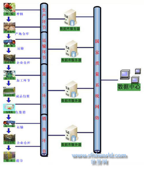 從蔬菜供應鏈整體可以看到,通過使用RFID技術,能夠方便地把整個供應鏈中各個環節的信息讀入公共數據庫,各個環節也可以方便地增加相應環節的數據。消費者和相關主管部門也可以通過通信網絡和終端進行查詢和追溯。
