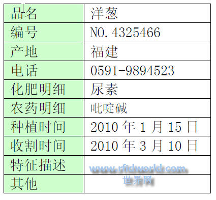 可為每一個地塊或一個品種設定一個標簽,對該地塊或該品種蔬菜從種植到打包實施的整個過程中的必要信息通過讀入或輸入設備進行及時初始信息的錄入,如蔬菜品種、生長時間、噴施農藥的名稱及次數,使用的化肥、收割時間等,甚至包括該品種的特點描述,根據農產品編碼標準,對每一類蔬菜設置一個編號作為其身份的唯一標識。這樣在該品種蔬菜完成供應鏈的第一個環節時,該電子標簽已經存儲了其所有基本信息。當收購企業對任何一個地塊的蔬菜品種收購時,通過采用數據采集器對農產品以及農產品進行信息采集,不僅加快了收購速度,降低了出錯率,而且為農產品加工企業提供了POS系統、EDI(電子通關系統)、藥物殘留測試系統、電子商務等系統的基礎數據,為產品溯源提供源頭數據。以某地某種植基地的洋蔥為例,其電子標簽包含的內容如圖