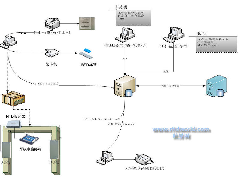 系統由電子標簽、天線、閱讀器、檢測外界環境參數的傳感器、食品安全數據庫、食品安全評估算法和相應的服務網絡組成,其突出特征是,粘貼于食品包裝上的電子標簽;溫度、濕度、關照度等傳感器;利用RFID公共服務體系構成食品安全管理系統,基于食品質量信息和環境數據的質量評估系統和追溯系統。