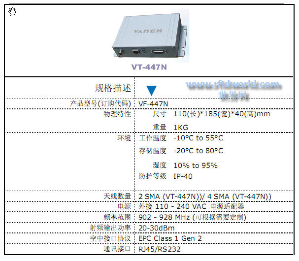 VF-447N是一款高性能閱讀器,采用ARM雙核處理器,集成TCP/IP網絡通訊接口,可以外接最多4個天線,可方便的組成RFID讀取識別網絡。