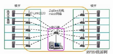 解決方案 如圖所示,在樓宇內布置由溫度采集器和ZigBee無線數傳終端組成的溫度采集點,采集的溫度數據通過IP-Link2220所組成的ZigBee無線mesh網絡把各處的溫度數據傳回中心端。中心端可根據各方采集的數據進行合理判斷,保持取暖用戶室內溫度均衡穩定,有效利用煤炭等取暖資源。溫度采集點架設靈活,可根據具體需求和項目成本靈活架設。