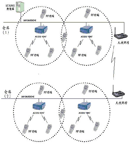 系統應用以集中服務為核心,針對于倉儲管理的需求,移動節點之間無須通信,在現場內部以無線RF網絡拓撲結構為訪問節點連接型。RF移動終端的操作區域遍及商店的各個角落,要求移動終端在商店內部的任何地點,都能和服務器主機保持實時的通訊。因此,在系統網絡架構中,必須保證安裝的 AP 點能對整個商店進行無線信號的全覆蓋。如果商店的面積較大,在進行無線網絡設計時,可以充分利用無線RF技術的網絡擴展能力和無縫漫游特性,對商店的無線信號進行多個AP 點的組合,即通過設置多個AP節點,作到信號的全覆蓋,而且相鄰AP之間互為冗余,提高無線網絡的可靠性。同時考慮到大型倉儲商店的辦公區可能與賣場不在同一區域,而且不便使用有線網絡連接,因此商店與辦公區之間可以采用無線網橋連接,使之成為統一的網絡體系,便于網絡的擴展和拆除。