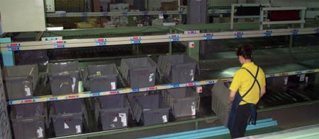 物流作業:八條Put-to-light電子配貨線、每線可以處理92家店