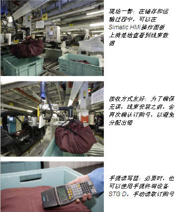 目前的訂購號可以通過 Simatic HMI 操作面板查看,該操作面板同時顯示主要的存儲/轉換站和輔助存儲/轉換站的數據。在輔助站中,如果線束無法確認時,可以利用手提讀寫器 STG D 來進行手動檢測和分配。