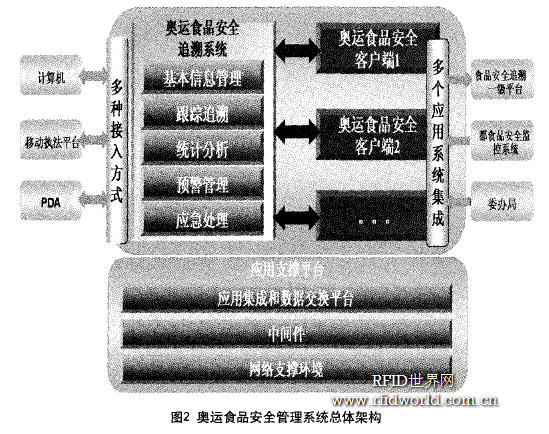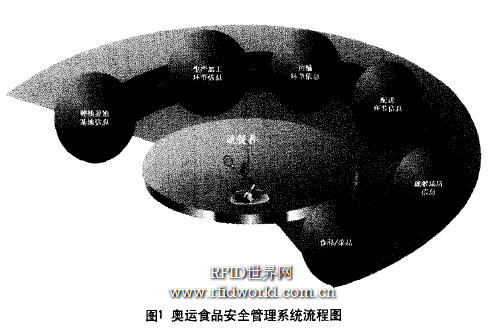 奧運食品安全(RFID)追溯管理系統包括以下子系統:奧運食品安全管理中心;奧運食品專用倉庫系統;奧運食品加工中心系統;奧運食品物流企業系統;奧運食品生產、養殖基地系統;奧運食品銷售點系統;奧運食品運輸監測點系統。