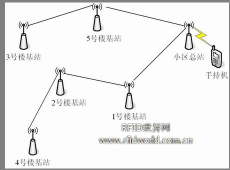 基站網絡是指樓宇與樓宇之間的無線網絡。每棟樓的頂部都裝有一個基站,用于傳輸本棟樓采集到的數據和轉發其它樓宇的數據。網絡遵行鏈路越短越好的,能夠直接到達的不采用中繼。其組網示意圖如圖2所示: