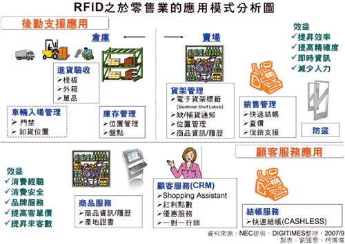 面對諸多問題,全球各大零售商莫不期望可以透過資訊科技加以改善,而RFID則成為首選技術之一。NEC系統事業群Business支援部經理紀駿德認為,零售業在RFID的應用可以分為2大部分,其一為后勤支援應用的「倉庫端進貨、庫存管理」,主要目的在于提高進貨驗收的效率以及正確性、庫存貨的可視性,其二為顧客服務應用的「門市端客戶服務及銷售」,目的為提高客戶關系管理、快速結帳、防盜、查價、產品履歷以及促銷效率化等作業。