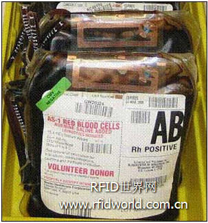 當血庫抽取血時,員工采用貼標的血袋,接著對標簽寫入日期和時間,及血型、獻識別碼、過期日期。中心將接著處理血液,將它分離放在幾個產品容器里,每個容器貼有 RFID 標簽,寫入產品的來源數據。當一個處理過血袋準備離開血庫,送往醫院時,標簽將再次被讀取,登記血袋的離開,及時間和日期。當醫院收到血袋時,在芯片內存的一個獨立區寫入數據,如輸血病人的醫藥記錄、出生日期。當血液被分配到病人,當血袋標簽再次被讀取,從而確認病人接收正確的血產品。在一些情況下,如果出現輸血延遲,標簽寫入數據延遲信息,接著未使用的血袋被送回血庫。