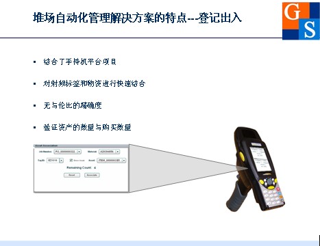 當設備到達卸貨場時 在設備上貼上標簽該設備就有一個識別代碼輸入計算機或定位服務器然后這些設備放入倉庫,工人們只要訪問庫存清單就可以選擇所需設備核材料。將設備信息傳輸至手持讀寫器,員工拿著手持讀寫器只要經過貼簽的設備很快就能找到所需設備。手持讀寫器屏幕上的指針指向所選擇的設備。接近設備時手持讀寫器上顯示設備的距離分發出警報,指引工作人員找到設備。 易于使用的手持讀寫器屏幕上用紅點顯示標簽,資產的定位,用移動的藍點顯示用戶的位置。點擊紅點可以獲得更多標簽信息。