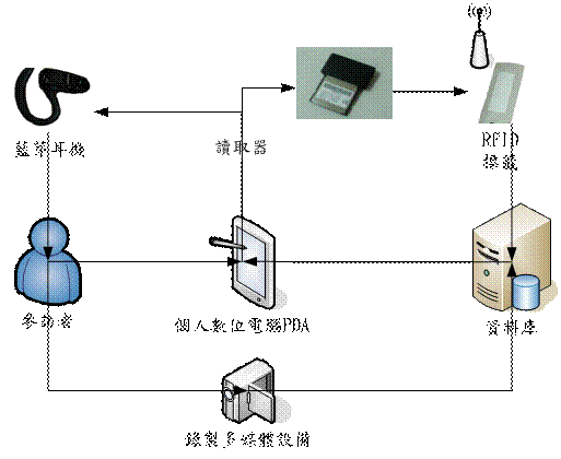 古月民俗館行動導覽系統共分為二部份,一為導覽資料登錄系統,另一為多媒體播放系統(圖1 ) 。導覽資料登錄系統主要為設定的RFID標簽所對應到的多媒體資料,此系統為導覽單位之管理者所使用。而多媒體播放系統則為入館參觀者可利用的PDA上附的讀取器去讀取展品上的RFID標簽后,多媒體播放系統將依據讀取到的號碼去播放導覽資料登錄系統設定好對應的解說內容,此為參觀者所使用。