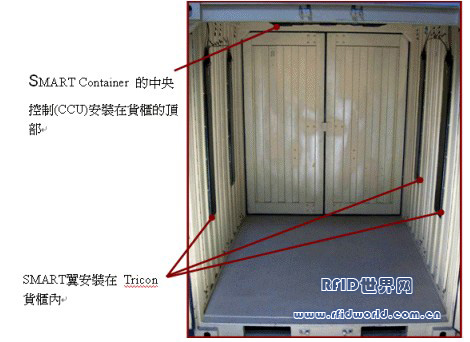 本次榮獲大會關注的Self-inventorying智慧型貨柜藉由中央控制器(CCU)并通過一套持久可再充電的鋰離子電池,由中央控制負責供給動力,并能設定熟睡功能以支撐電力延長的用途。中央控制器也包含了感應器(Sensor),負責對數據的收集,例如光、熱、濕氣和振動的感應器。其中最重要的是,中央控制器提供多平臺傳輸功能以利主動式RFID、衛星,手機和Wifi等收受訊息。