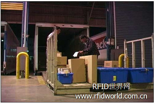 在裝載臺,一臺RFID閱讀器讀取卡車里每個塑料集裝箱的標簽