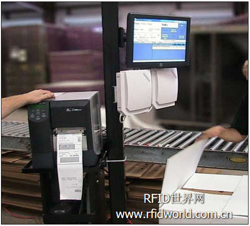 小量的訂單通常通過 Federal Express 運送。在這種情況下,操作員在一臺與 RFID 閱讀器相連的觸摸屏上選擇訂單和箱子的尺寸。觸摸屏顯示訂單所需的貨品,閱讀器捕獲每個托盤的 ID 碼,當托盤被裝進箱子里,屏幕升級訂單完成數據。如果閱讀器檢測到一個不正確托盤,系統發出警報。當訂單完成裝貨后,操作員在屏幕上按下“裝貨完成”提示。軟件接著進入 Fed Ex 網站,生成一個貨運標簽,連同包裝單一起被打印出來,粘貼在箱子上。