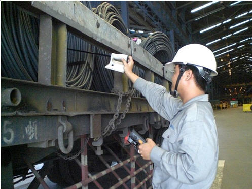 圖1檢核站人員使用Barcode讀取器確認產品資料(資料來源:中鋼公司運輸處)