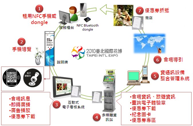 此外,為了提高民眾至花博參觀的意愿,亦首度于多媒體播放器(Set-top Box)上研發于與NFC整合技術,民眾看到想下載的優惠券時,可拿NFC手機或NFC Bluetooth Dongle 輕觸讀卡機,即可完成優惠券下載。此外,亦可以于多媒體資訊站上查詢及下載優惠券。最后,參觀者于攤位消費時可將NFC手機或NFC Bluetooth Dongle交給服務人員確認優惠訊息,就可享有折扣好康。
