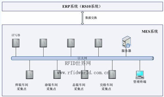 在焊裝車間的焊接上線點、外蒙上線點、焊接下線點分別設置一臺超高頻RFID讀寫器,用于對進入焊裝車間生產線的車輛進行信息采集,并將信息通過以太網絡實時回傳至后臺管理系統。