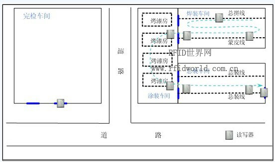 在總裝車間的總裝上線點、總裝下線點、交檢點分別設置一臺超高頻RFID讀寫器,用于對進入涂裝車間生產線的車輛進行信息采集,并將信息通過以太網絡實時回傳至后臺管理系統。