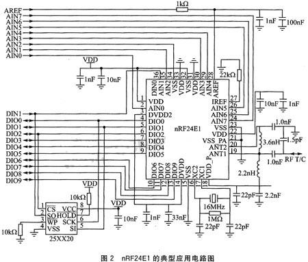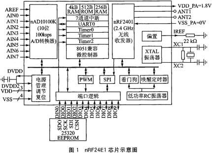 nRF24E1是一種工作頻率可達2.4GHz的無線射頻收發芯片。內部嵌有與8051兼容的微控制器和10位9輸入的A/D轉換器,可以在