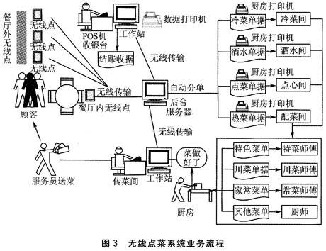 單打印和數據無線傳輸至收銀用機、傳菜用機;根據所得數據,收銀機結賬并打印賬單,傳菜機打印、傳菜、劃單,最后由服務員完成送菜、上菜。