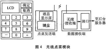 無線點菜系統中點菜模塊外觀及總體設計如圖4所示。其中發送、接收端通過nRF24E1芯片實現無線數據傳輸。