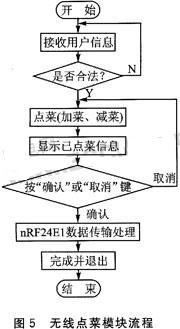 用戶完成點菜后,無線點菜終端會將點菜數據傳輸給遠程服務器,并給出"您已成功點菜!"的顯示信息,用戶此時可以退出系統。對于餐廳外的外賣點,5 min內用戶不再進入系統修改或取消點菜信息則自動從用戶卡中扣款完成結賬,并在指定時間內為用戶烹制好所點菜肴送到指定位置。