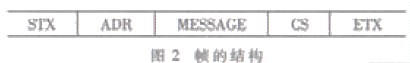 射頻識別模塊采用瑞典TagMaster AB 公司的2.4GHz 產品S1510。該模塊體積小, 專為手持設備設計,可以采集1米內各種電子標簽上的數據。它通過USART串口與處理器通信, 接口簡單, 易于硬件實現。為了保證數據的可靠傳輸, 模塊與微處理器通信采用TagMaster AB公司開發的應答式串口通信協議ConfiTalk。ConfiTalk 協議是一種面向字符的應答式串行通信協議。它每次傳輸一定長度的數據塊( 幀) ,每個幀包含幀頭(STX)和幀尾(ETX)。為了提高數據傳輸的可靠性,每幀又加入了8 位的校驗位(CS)及地址位(ADR)。幀的結構如圖2。