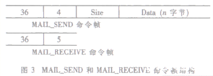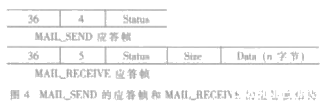 MAIL 命令方式通信也就是把幀中的MESSAGE 域統一成四種格式, 其中命令幀有MAIL_SEND 和MAIL_RECEIVE兩種,分別表示S1510 接收用戶信息和返回卡信息(包括卡號、卡狀態和卡存儲的數據), 如圖3。