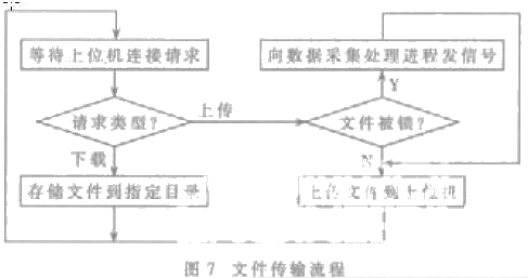文件傳輸是一個進程, 完成卡信息的上傳及其他數據的下載。與上位機通信采用Clinet/Server 模型。該進程實質上是一個服務器端(本系統) 的應用程序, 它循環等待客戶端( 上位機) 的連接請求。當請求到達時, 首先判斷請求來自哪個接口(USB 或者紅外接口),然后根據請求的類型執行相應的上傳或下載。考慮到實際應用中可能會使用多臺手持式閱讀器, 為了方便上位機對信息的管理,規定文件名由手持式閱讀器編號和文件上傳序號組成, 程序在上傳文件時自動將其編號及上傳序號加入文件名。該進程的流程 如圖7。