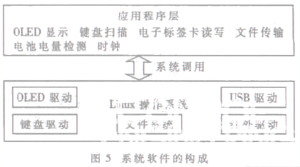 系統軟件是整個系統的靈魂, 其設計的好壞直接影響系統的穩定性和可擴展性等性能。系統設計將軟件分為兩層結構, 如圖5所示。最下面一層為操作系統層, 主要實現對Linux 操作系統的移植和各種設備驅動程序的編寫, 包括OLED 模塊、USB? Device、紅外、鍵盤等設備驅動程序。上一層為應用程序層, 主要實現卡信息顯示、鍵盤掃描、電子標簽卡讀寫、文件傳輸、時鐘以及電池電量檢測等功能。