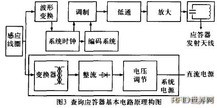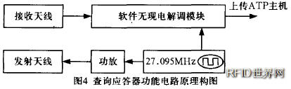 查詢應答器由地面應答器、車載查詢器、發射天線、軌旁電子單元LEU (可變應答器才有,用于列車控制中心為地面應答器傳送臨時可變信息)四部分組成。地面應答器的電源取自正在通過的機車上的查詢器發射的27.095MHz信號,地面應答器利用對該頻率點的電感耦合取得工作所需能量。地面向機車傳輸數據的載頻為4.237MH z,可以確保列車高速通過瞬間完整讀出數據報文。當機車駛過地面應答器時,車載查詢器首先通過電磁感應方式將能量傳遞給地面應答器,地面應答器在接收到來自列車的能量后開始工作,通過整流電路提供可靠的電源,為應答器工作提供能量,將報文數據以頻移調制方式通過電磁感應傳送至車上。其基本電路原理框圖如圖3所示。