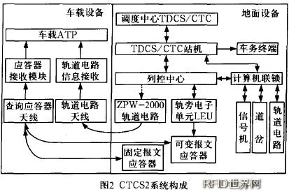 隨著第六次大提速的實施,速度將突破160km/h達到200~250km/h,列車必須裝設列車控制系統;TDCS/CTC等系統的應用,傳統的區域分散控制轉變為統一指揮,對臨時限速設置方式等帶來了革命性的變化,需要為運行中的列車提供臨時限速信息。立足于我國既有信號技術裝備, 參照歐盟ET C S相關標準,我國自主研發了完全擁有自主知識產權、符合我國國情的CTCS2級列車控制系統實施方案:通過軌道電路提供與前車(目標)距離和進路狀態等實時連續信息,由列車控制中心控制應答器發送線路參數、進路信息和臨時限速,列車車載設備自動生成連續速度控制模式曲線,實時監控列車安全運行,巧妙地解決了信息連續要求和信息量的矛盾。CTCS2系統構成如圖2所示。