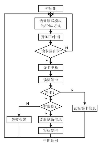 在中斷程序中,首先讀取試條卡的序列號和標志信息,判斷是否為經過測試的新卡,若是已經測試過的試條卡,則直接從電子標簽中讀取記錄結果及之前的測試時間,并予以顯示。若為新卡,則進一步判斷試條的有效期,若已失效,則予以報警。只有沒有失效的新卡,才會啟動試條的閱讀,并將測試結果、測試時間寫入到電子標簽中。