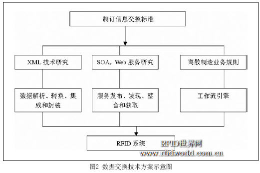 與PDM、ERP 等上層軟件的數據融合問題,主要通過理解基于RFID技術的離散制造業務流程和所涉及的動態數據,包括:過程數據、狀態數據和控制數據;引入PML技術,研究基于PML的離散制造過程動態數據的封裝、解析和轉換,從語義和結構上理解數據,建立PML到數據庫管理系統的映射,為動態數據的管理提供基礎支撐;應用SOA架構和Web服務技術,研究離散制造動態數據的采集、發布、發現、組合、分發、獲取等各種服務實現。數據交換技術的方案如圖2所示。
