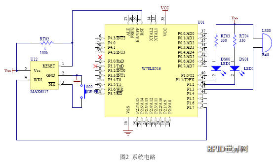W78E516的P1.1,P1.2各接了一個發光二極管,P1.3接了一個蜂鳴器,作為各種提示用。W78E516系統電路如圖2所示。