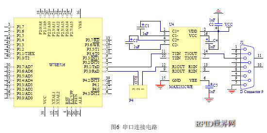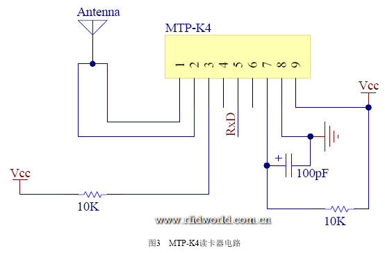MTP-K4有兩種輸出格式:韋根26位/RS232 TTL(ASCII)。在這里我們使用RS232 TTL(ASCII)輸出格式。MTP-K4總共有9個引腳,引腳3接高為RS232 TTL(ASCII)輸出格式,接低為韋根26位輸出格式。故Pin3在這里接高。天線接在引腳1和引腳2之間。引腳4可接蜂鳴器或者LED,這里把它懸空。引腳5為TX非反相輸出,在這里把它接到CPU的P3.0/RxD管腳上,引腳6為TX反相輸出,這里把它懸空。引腳7低電平復位,引腳8接地,引腳9接VCC,VCC范圍可從4.6V至5.5V。MTP-K4讀卡器電路如圖2所示。